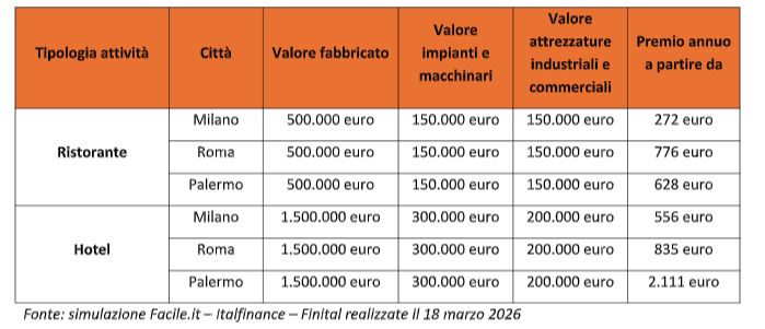 Una simulazione di Facile.it, Italfinance e Finital ha cercato di calcolare i costi delle coperture assicurative aggiornando parzialmente una statistica già pubblicata su dati di settembre 2024. L'inchiesta, effettuata lo scorso 16 marzo, prova a ricavare i premi per un ristorante e un hotel in tre città campione, e cioè Milano, Roma e Palermo.